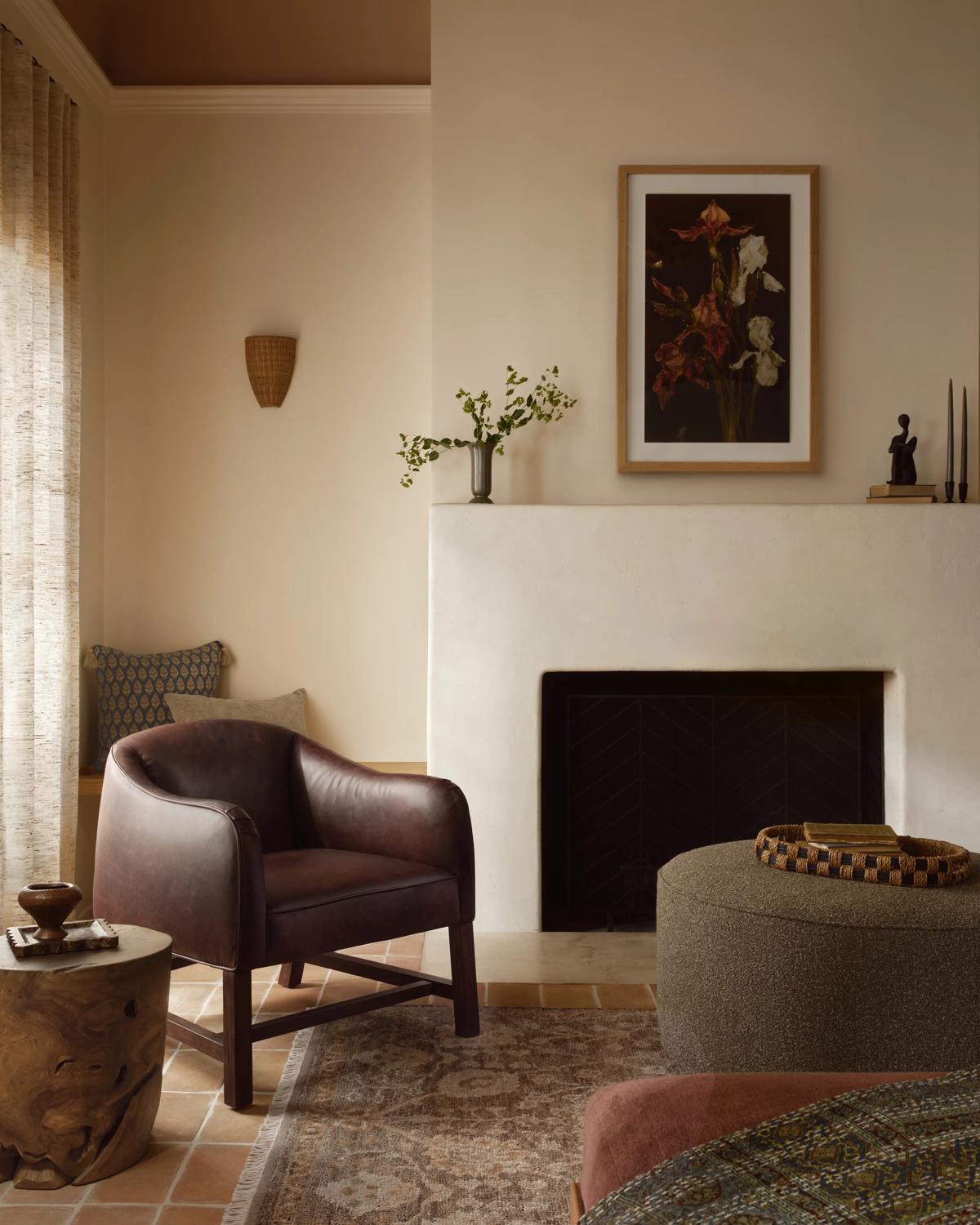 In choosing the pieces for this design, we focused on unique silhouettes and materials that tell a story—like leather and marble—to create a balance of soft and bold. Textile art, geometrical shapes, and low, modern furniture filled the Spanish Revival, communicating comfort and a well-traveled point of view. A home that gives the feeling that it's inhabited by artists, or the best-read people you know.