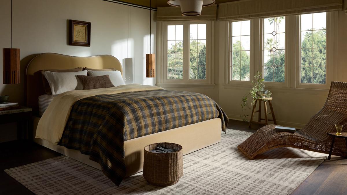 Inspired by menswear patterns, Drew dressed his bedroom in plaids and striped patterns, choosing the Arlington Rug and the Kerr Pillow to add complementary designs and texture to the space.