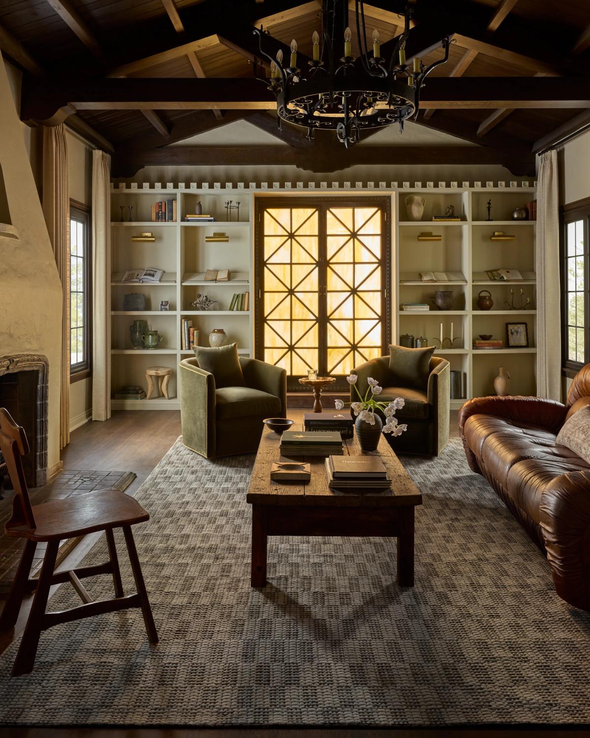 The living room captures the spirit of Drew’s 1920s Spanish Colonial—all romance and Baroque-inspired elements. To complement that style, he chose the contemporary-classic Olvera Rug, which was inspired by vintage tiles found around his home.