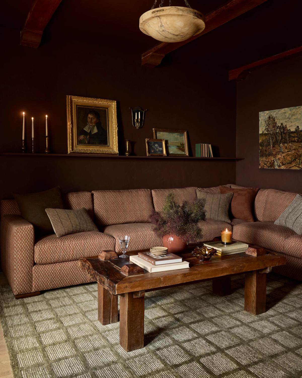 Depth and dimension rule the movie room, dressed up with antique-inspired flourishes and a dark palette. The Kinney Rug and Kerr and Turner Pillows add dimension—and plenty of texture—with their varying striped designs.