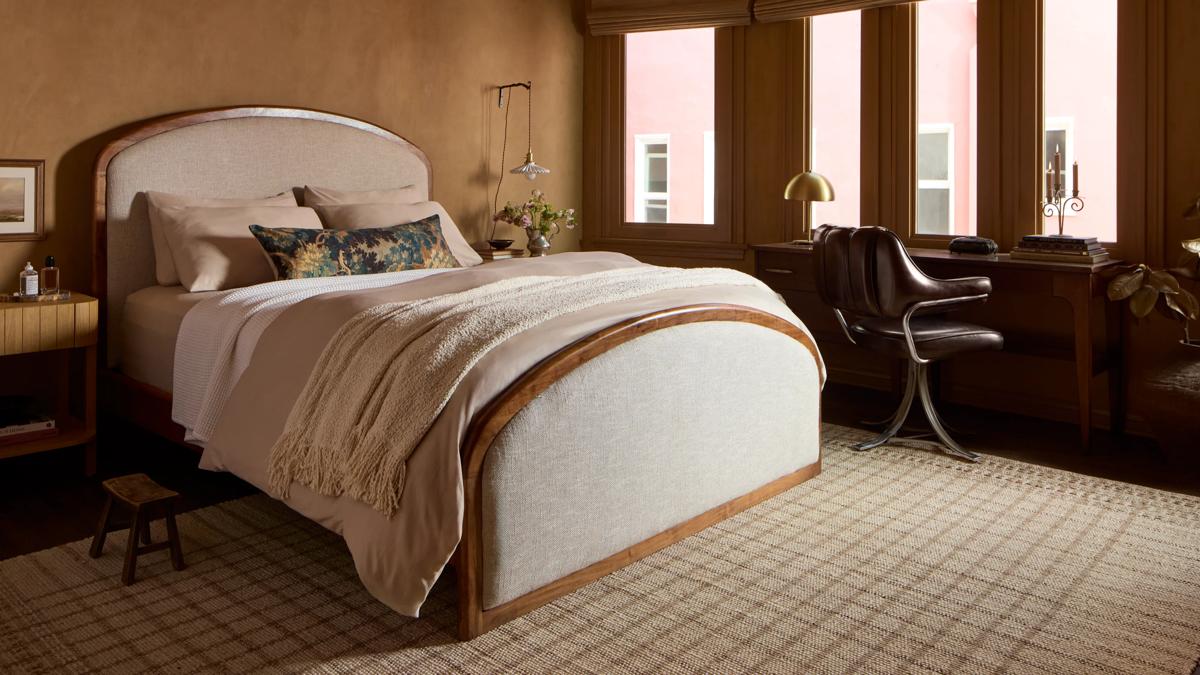Where modernity meets romance: Marie’s bedroom embraces softness and organic elements, layering on the textures and neutral hues. The Runyon Rug provides a warm foundation while the Hepburn Pillow adds a pop of color.