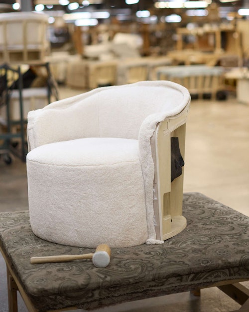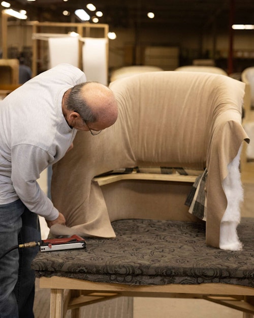 On to the upholstery station. The artisan pulls the fabric over Burton’s cushioned frame, securing it by hand.
