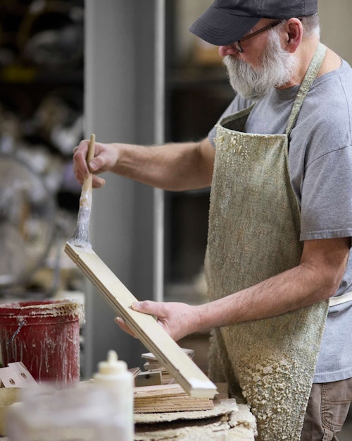 First comes the foundation: An artisan builds Burton’s base, laying out the pieces like a puzzle then gluing and nailing them into place.