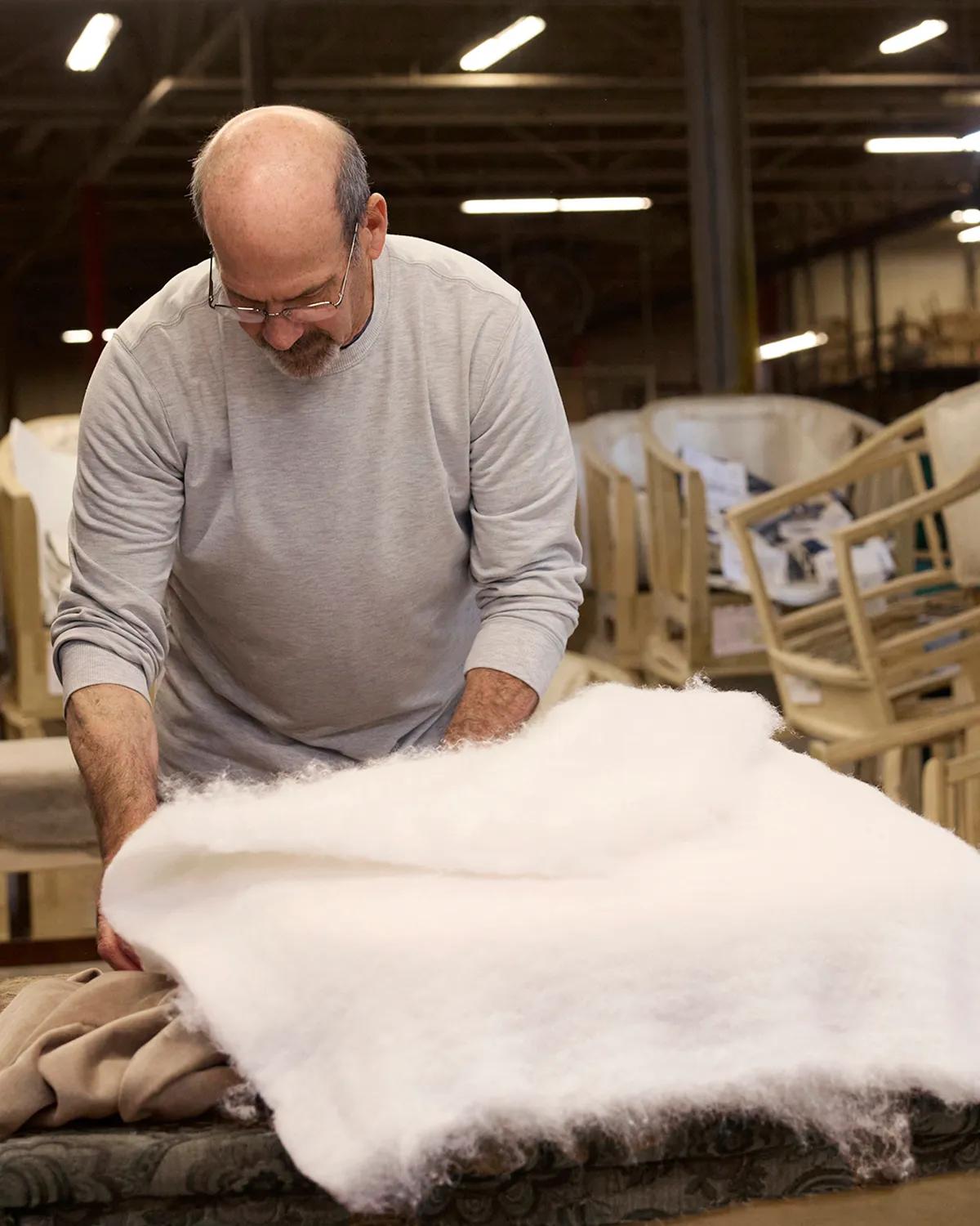 After the frame has been filled and cushioned, upholstery can begin. An artisan drapes and pulls the fabric over the sides of the furniture, tucking, cutting, and detailing it so that not a seam or thread is out of place.