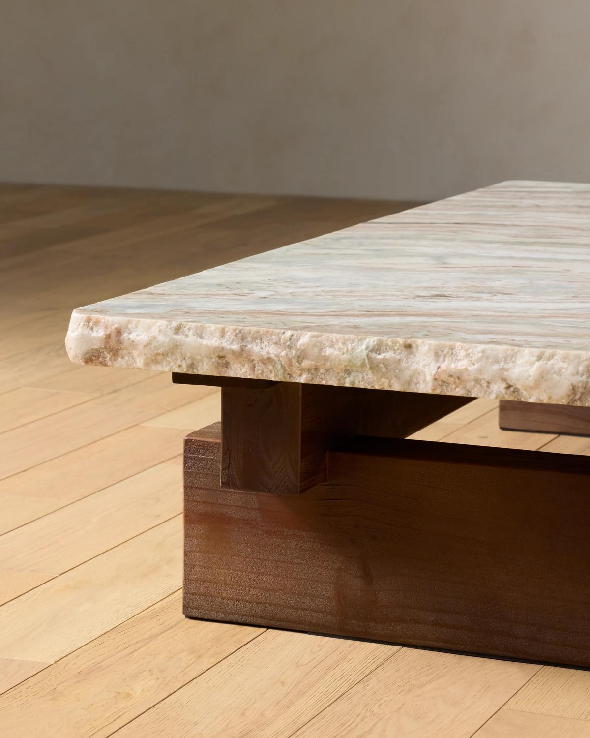 Each piece in this collection is handmade by artisans, featuring a slab-marble top and pine base. The top features raw edges, upping the organic feel of this piece, while its geometric base speaks to inspiration rooted in Japanese architecture.