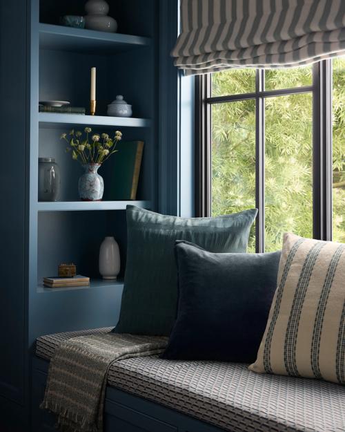 Layer on the color and charm with Harriman. This throw pillow is simply striking in blue and white, with detailed stitches that draw the eye right in.
