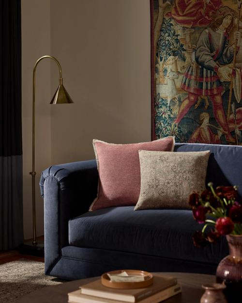 A snapshot of traditional craft—This throw pillow is woven with a design inspired by vintage rugs, with fading that suggests many lives lived.