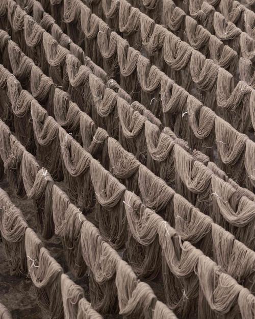 Wool rugs start with raw fibers. The Katwari (spinner) layers strands together on a bristled pad, brushing them to remove clumped dirt and knots. She then spins the wool on a charka, creating the yarn.